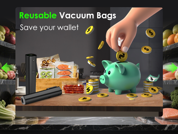 Portable, USB-rechargeable vacuum sealer + reusable bags — save money and reduce waste.